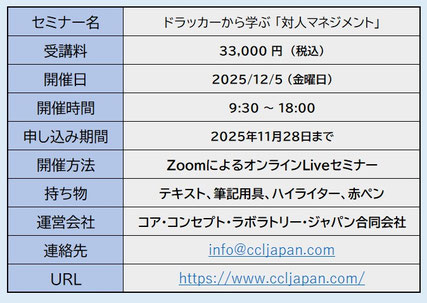 実は、ドラッカーの対人マネジメントは、その革新性の高さから、多くのリーダーや管理職によって理解されないまま時間が過ぎていきました。日本での定着は高いとは言えず、一部の会社で部分的に実践されているのが実態と言えます。ドラッカー理論を理解することによって、受講者のマネジメントは確実に変革を遂げることになります。このセミナーは、対人マネジメントをもう一度復習しようとする企業様や管理職の方々に捧げられています。幅広い階層の方々が、このセミナーを通じて、貴重な学習とスキル向上を体験をされることでしょう。時間短縮のために、参加者同士の協働ワークやロールプレイ等を排除している関係で、他の参加者に気兼ねすることなく受講することができます。